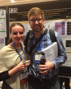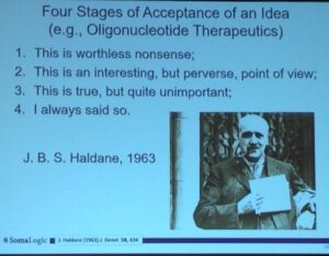 Nebojsa Janjic (SomaLogic) delighted us with a quote from J.B.S. Haldane (see picture). He then elaborated on his work on using amino acid side chains to increase chemical diversity of aptamers, some of which I have covered here. Angelo Moreno (Duke University) gave a presentation on PEGylated aptamer inhibition by Anti-PEG antibodies, a talk highly relevant to anyone using PEG in human therapeutics. Apparently, 44% of healthy individuals have such antibodies. Not only are they the cause of the Pegnivacogen allergic reactions that led to termination of its clinical development, but they also decrease therapeutic efficacy of aptamers. This isn’t just an aptamer issue either! In the previous session Joe Senn (Moderna) showed how anti-PEG IgM antibodies inhibit delivery of PEG-containing mRNA LNPs to liver hepatocytes, and how they developed safer“faster PEG shedding” 3rd generation LNP vehicles.