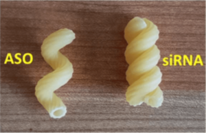 Two FDA representatives presented their personal views. Emily Place (FDA) gave an overview of the accumulated data on oligonucleotide therapies FDA holds in their internal database. So far, they have not identified any genotoxicity safety signals with oligonucleotide therapeutics. Hobart Rogers (FDA)then presented on how a drug is assessed by the FDA with lots of practical advice for the researcher (note the innovative use of pasta shapes to illustrate the essential differences between single-stranded antisense and double-stranded siRNA molecules – see picture).