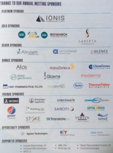 As usual for OTS meetings, there was a pre-conference educational session which was recorded and these videos are available on the OTS website here. Mano Manoharan (Alnylam) started off the session with a general introduction to the field using the examples of the FDA approved oligonucleotide therapeutics fomivirsen (Vitravene, antisense), pegaptanib (Macugen, aptamer), mipomersen (Kynamro, gapmer antisense), eteplirsen and nusinersen (Exondys 51/Spinraza, splice modulating) as well aspatisiran (ONPATTRO, siRNA) to illustrate the advances in oligonucleotide chemistry and delivery.